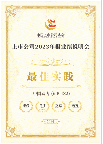 中國(guó)動(dòng)力獲評(píng)中國(guó)上市公司協(xié)會(huì)頒布的上市公司 2023 年報(bào)業(yè)績(jī)說(shuō)明會(huì)最佳實(shí)踐獎(jiǎng)