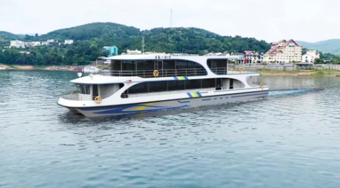 該客船(五島一村6號)由資興市五島一村水上旅游客運有限公司和中國船舶集團七一二所合作建造。船長30米,寬7.2米,動力498千瓦,采用具有自主知識產(chǎn)權(quán)的高安全級鋰電池技術(shù)、高可靠性直流組網(wǎng)技術(shù)和高效永磁推進電機技術(shù)建造。經(jīng)濟航速下最高里程可達110km,續(xù)航時間6小時,具有高環(huán)保性、高舒適性和低能耗、低噪音等特點。本項目的實施,是中國船舶集團七一二所在綠色智能新能源船舶領(lǐng)域的又一重要突破??痛A計今年10月份建成下水。