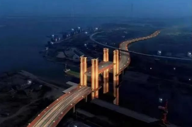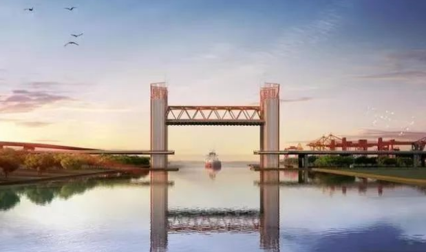 該橋?qū)儆谖錆h市青山區(qū)右岸大道(建設(shè)十一路至焦沙二路)北段工程的項目之一。右岸大道北段工程位于長江以南,西接青山主城區(qū),東連化工區(qū),是實現(xiàn)武鄂同城的重要連接通道。其上跨工業(yè)港運河,由于有通航需求,以及汛期水面上漲因素,因此采用了垂直升降開啟橋的橋型。該橋主跨104米,寬度31米,2650噸重的鋼箱梁由4臺提升系統(tǒng)操作升降,每臺提升系統(tǒng)有2個卷筒,一端懸吊鋼梁,另一端懸吊平衡重。全橋8套平衡重組,分別置于兩端塔樓內(nèi)。橋面平時距離水面的通航凈空高度8米,最大可提升27米。橋面提升時,就像坐電梯一樣升高。上橋位置安裝了移動護欄,當(dāng)橋面升起后,有橋梁管理人員對車輛進行有序管控,暫停上橋。