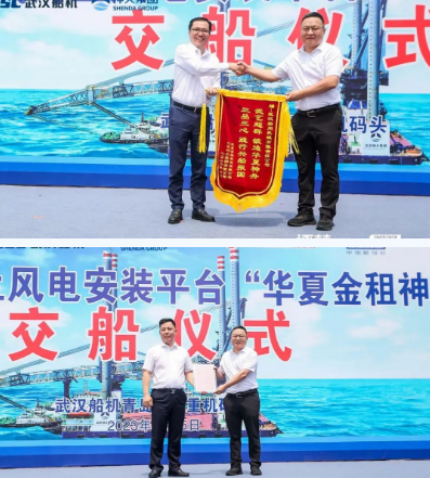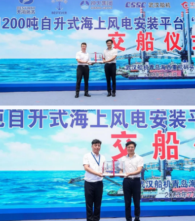 武漢船機黨委書記、董事長馬聚勇,北京神大集團有限公司總經(jīng)理張曉飛,飛勵特船舶管理有限公司副總裁馬利,華夏金融租賃有限公司總裁沈宗慶先后在交船儀式上發(fā)表講話。隨著國家實現(xiàn)“碳達峰、碳中和”目標指引,清潔能源迅速發(fā)展,我國海上風電投入布局和建設加快。為獲取更多的海上風能資源,海上風電正向深遠海風電場拓展,華夏金租神大01號1200噸自升式風電安裝平臺因此而生,是開發(fā)深遠海風電資源的又一利器。該平臺的順利交付,不止是武漢船機依托技術創(chuàng)新、裝備優(yōu)勢、努力拼搏的成就,更是船東、船東代表、監(jiān)理、分包方共同努力耕耘海上風電市場結(jié)出的又一碩果?!?