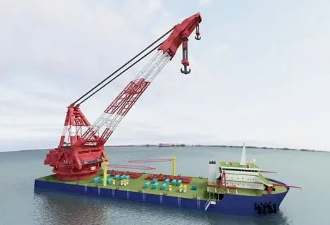 該1000噸全回轉起重船設計總長130米、型寬37.2米、型深8.8米,主起重機在固定尾吊工況下起重能力可達1300噸,在全回轉工況下起重能力為1000噸,吊裝最大高度可以達到甲板以上90米,主要用于架橋過程中鋼箱梁吊裝、混凝土箱梁吊裝、鋼圍堰安裝以及鋼管樁插打等橋梁施工作業(yè)。區(qū)別于一般全回轉浮吊船,該船的1000噸全回轉起重機在通過橋梁時其A字架具備快速放倒功能,放倒后整船水線以上通航高度不超過24米,起重機最高處距主甲板不大于 20.5m,極大地提高了通航能力。