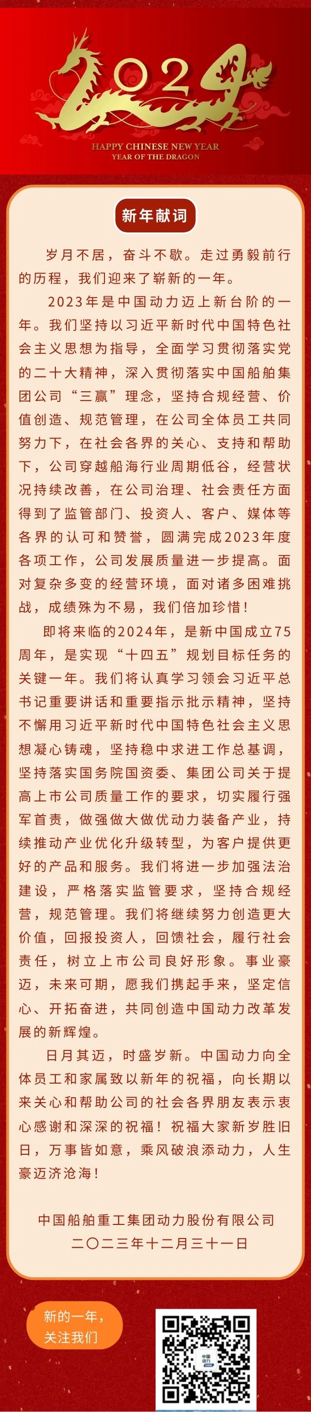 中國(guó)船舶重工集團(tuán)動(dòng)力股份有限公司2024年新年獻(xiàn)詞