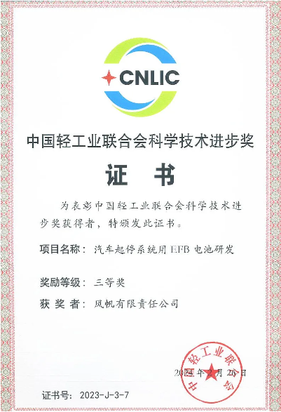 中國輕工業(yè)聯(lián)合會科學技術(shù)進步獎是中國輕工業(yè)聯(lián)合會設(shè)立的最高輕工科技獎項,屬于國家部級科技獎勵,被認為是輕工業(yè)的“榮譽勛章”。汽車起停系統(tǒng)用EFB電池項目獲得該項榮譽,是對風帆技術(shù)研發(fā)實力的充分肯定。