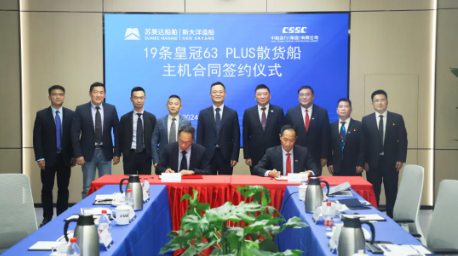2024年5月15日,蘇美達(dá)股份下屬蘇美達(dá)船舶有限公司旗下新大洋造船有限公司與中國船舶集團(tuán)下屬中船動(dòng)力(集團(tuán))有限公司旗下滬東重機(jī)有限公司在滬簽訂了19條皇冠63 PLUS散貨船主機(jī)合同。蘇美達(dá)船舶黨委書記、董事長何雋,黨委副書記、總經(jīng)理徐斌,財(cái)務(wù)負(fù)責(zé)人朱長城,中船動(dòng)力集團(tuán)黨委書記、董事長李琤,黨委副書記、總經(jīng)理邵煜出席簽約儀式,新大洋造船副總經(jīng)理金文剛與中船動(dòng)力集團(tuán)副總經(jīng)理張仲領(lǐng)分別代表雙方簽字。新大洋造船、中船動(dòng)力集團(tuán)市場營銷中心以及滬東重機(jī)相關(guān)負(fù)責(zé)人一同參與見證。