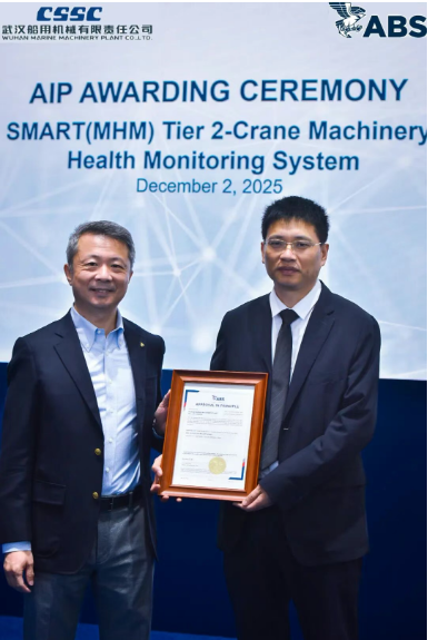 12月2日,2025年中國(guó)國(guó)際海事技術(shù)學(xué)術(shù)會(huì)議和展覽會(huì)開(kāi)幕首日,中船武漢船機(jī)開(kāi)發(fā)的海工吊機(jī)智能化健康監(jiān)測(cè)系統(tǒng)(SMART系統(tǒng))獲得ABS船級(jí)社SMART(MHM TIER 2)原則性批準(zhǔn)(AIP),這是國(guó)內(nèi)海工吊機(jī)首個(gè)成功取得該AIP認(rèn)證的系統(tǒng)。ABS船級(jí)社技術(shù)副總裁谷海、中船武漢船機(jī)副總經(jīng)理胡發(fā)國(guó)出席發(fā)證儀式。