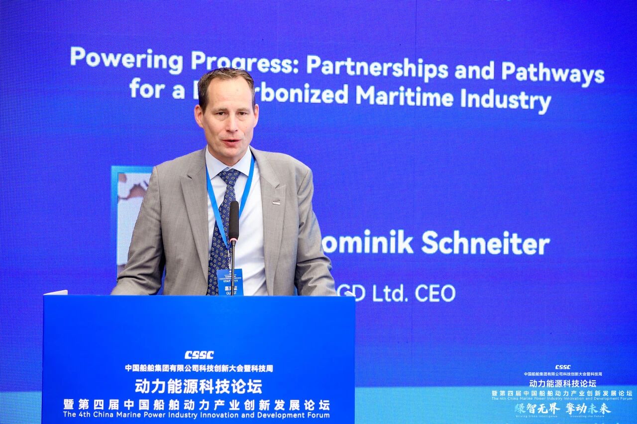 WinGD公司 CEO Dominik Schneiter 分享了國(guó)際海事產(chǎn)業(yè)脫碳合作的實(shí)踐路徑,強(qiáng)調(diào)航運(yùn)業(yè)脫碳需通過多燃料戰(zhàn)略、全生命周期解決方案與跨界協(xié)作實(shí)現(xiàn),并介紹了 WinGD X-DF 發(fā)動(dòng)機(jī)平臺(tái)在氨、甲醇等替代燃料應(yīng)用中的領(lǐng)先成果,以及與產(chǎn)業(yè)鏈伙伴協(xié)同推動(dòng)技術(shù)落地的經(jīng)驗(yàn)。