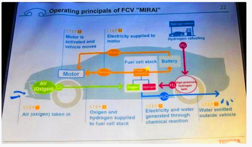644km,聽到這個數(shù)字相信很多朋友估計都會有一些小小的激動,畢竟咱們國內(nèi)續(xù)航里程最高的電動車差不多也就四五百公里了,而這臺車一來就是600多公里,這著實(shí)調(diào)動了人們的興趣。而說到這臺豐田Mirai的原理其實(shí)也很簡單,它利用空氣中的氧氣(綠色)以及氣罐內(nèi)的氫氣(紅線)在發(fā)電裝置內(nèi)發(fā)生反應(yīng),產(chǎn)生的電能(橙線)輸送給電動機(jī)用于驅(qū)動車輛,剩余的電能則儲存在電池中,用于車輛急加速或為車上的用電設(shè)備供電?;瘜W(xué)反應(yīng)之后產(chǎn)生的水(藍(lán)線)直接排除車外即可。