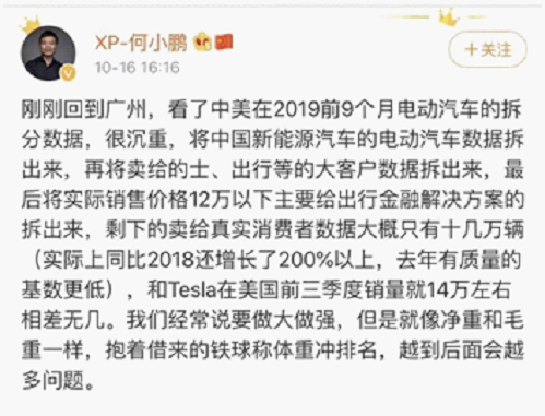 日前,小鵬汽車董事長何小鵬在其官方賬號上發(fā)文稱, 2019年前9個月,中國新能源汽車市場的電動汽車實際賣給消費者的數據大概只有十幾萬輛,和特斯拉前三季度在美國市場14萬輛的銷量相差無幾(考慮到中美人口的數量差異以及新)。原文見下圖: