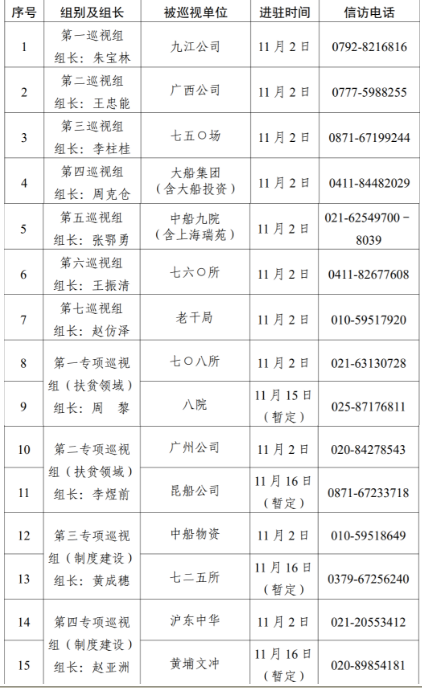 根據(jù)中國船舶集團(tuán)黨組對(duì)2020年第二輪巡視工作的統(tǒng)一部署,截止11月2日,集團(tuán)公司黨組7個(gè)常規(guī)巡視組已全部完成進(jìn)駐,對(duì)九江公司、廣西公司、七五〇場、大船集團(tuán)(含大船投資)、中船九院(含上海瑞苑)、七六〇所、老干局等7家單位開展常規(guī)巡視。集團(tuán)公司黨組4個(gè)專項(xiàng)巡視組采取“一托二”方式同步對(duì)七〇八所、八院、廣州公司、昆船公司、中船物資、七二五所、滬東中華、黃埔文沖等8家單位開展扶貧領(lǐng)域、制度建設(shè)專項(xiàng)巡視,4個(gè)專項(xiàng)巡視組目前均已進(jìn)駐首家被巡視單位。