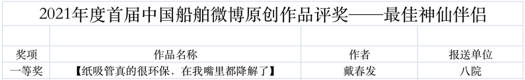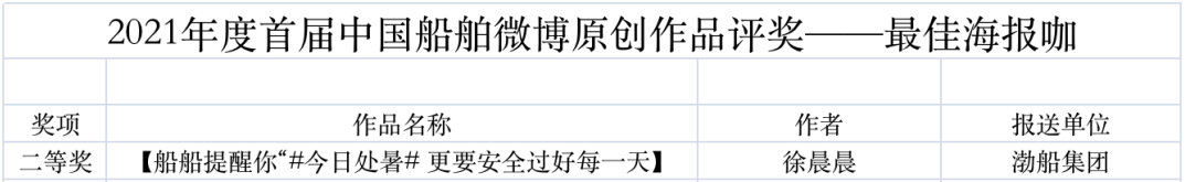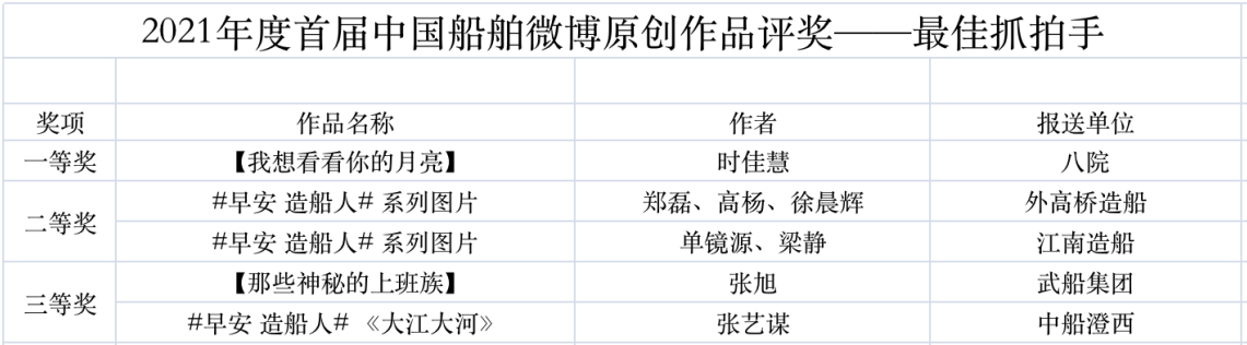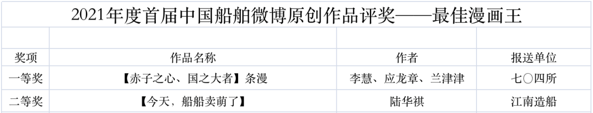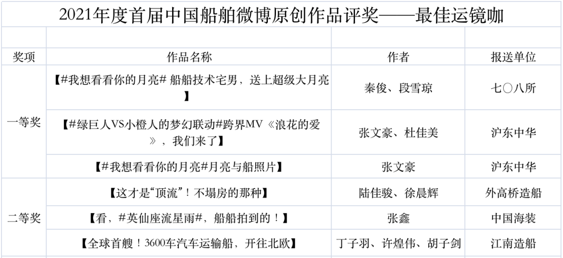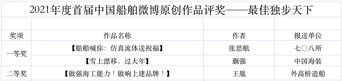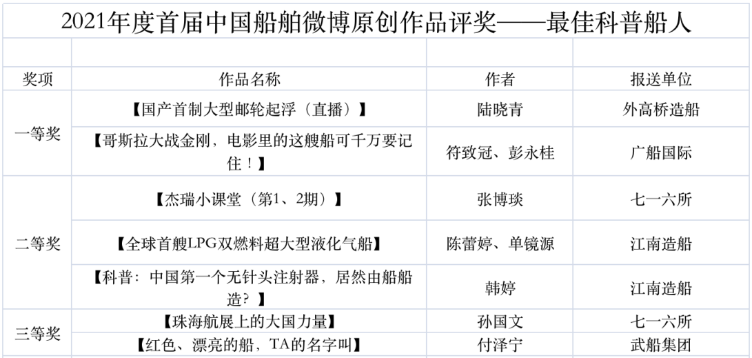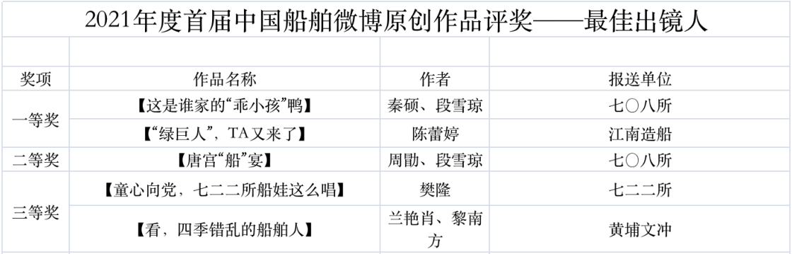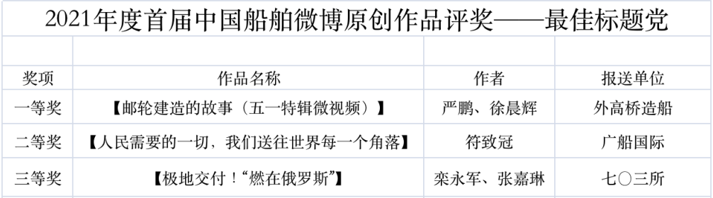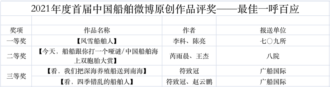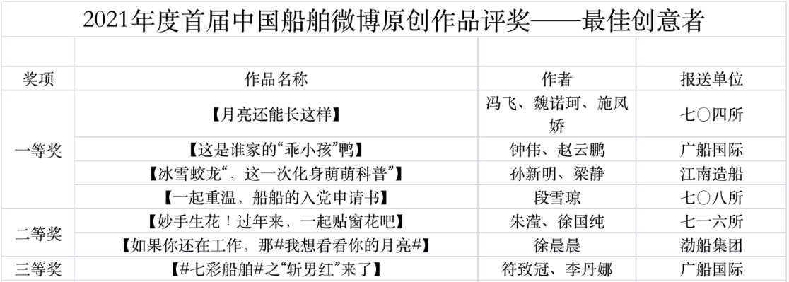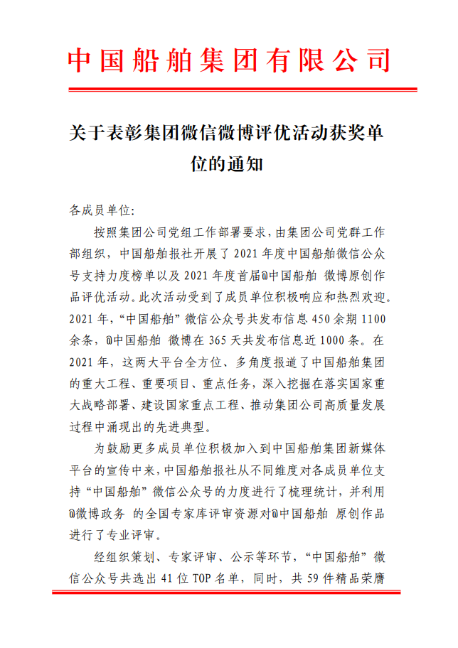 為鼓勵更多成員單位積極加入到中國船舶集團新媒體平臺的宣傳中來,在集團公司黨群工作部的指導下,中國船舶報社從不同維度,對2021年度各單位支持“中國船舶”微信的力度進行了梳理統(tǒng)計,并利用微博政務的全國專家?guī)煸u審資源,對2021年度“中國船舶”微博原創(chuàng)作品進行了專業(yè)評審,評選結(jié)果公布如下: