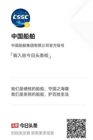 繼中國(guó)船舶官方抖音號(hào)之后,中國(guó)船舶官方頭條號(hào)今天也正式開(kāi)通!