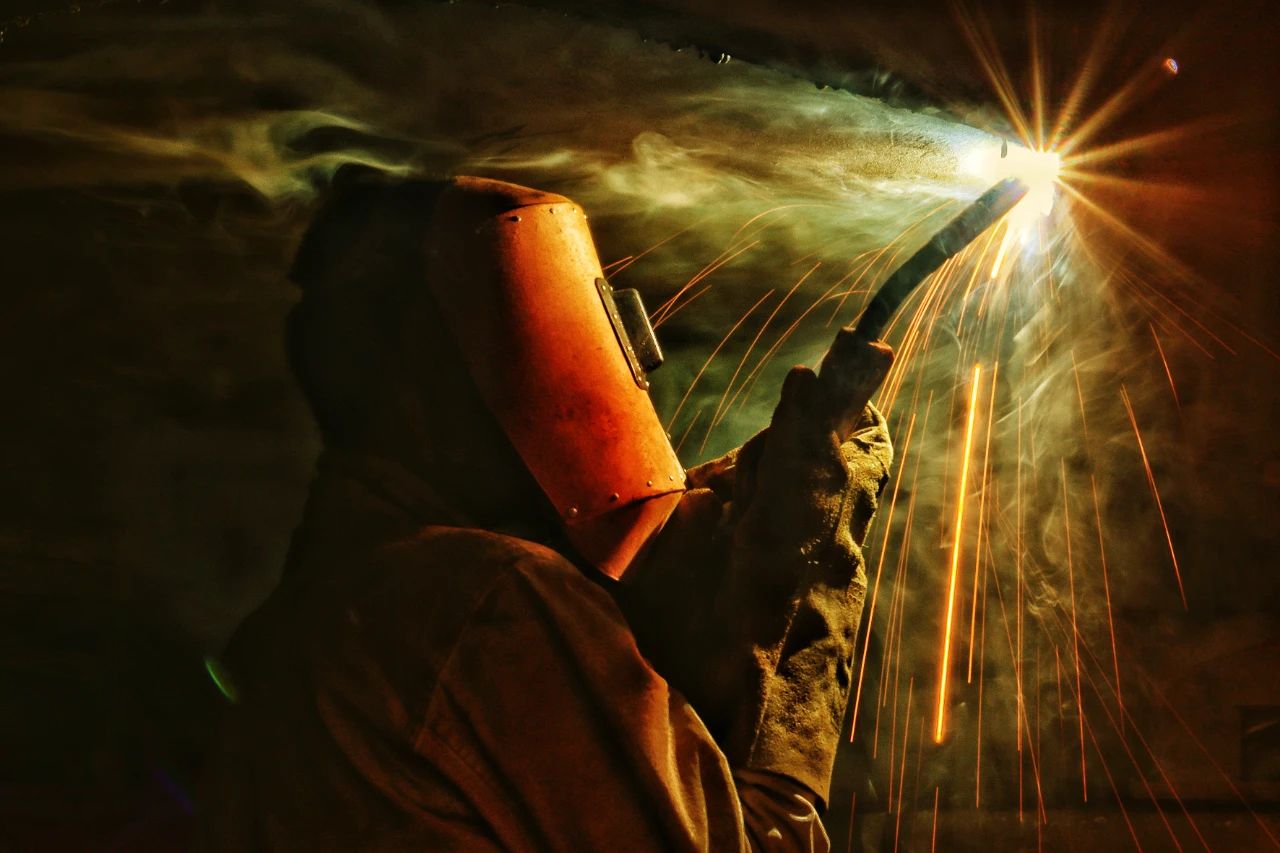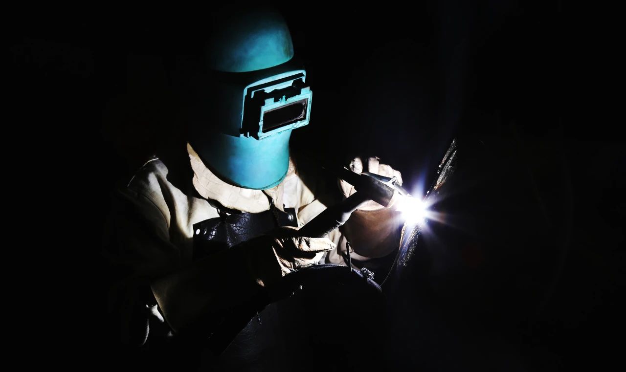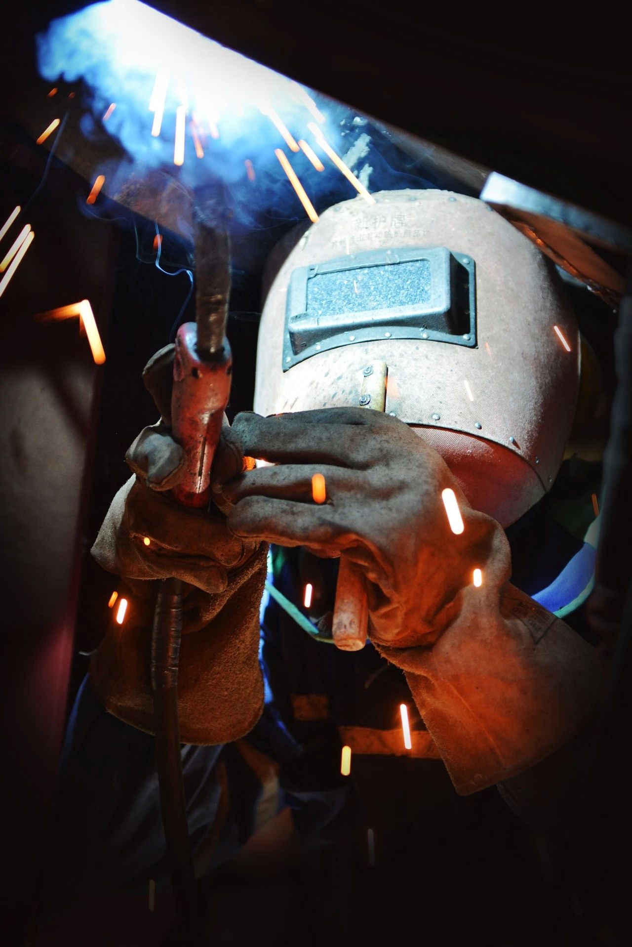 一位“全副武裝”正在進行焊接作業(yè)的焊工,焊花飛舞在狹小的工間里,折射出如彩云般的景象,猶如巨人正在“補天”。