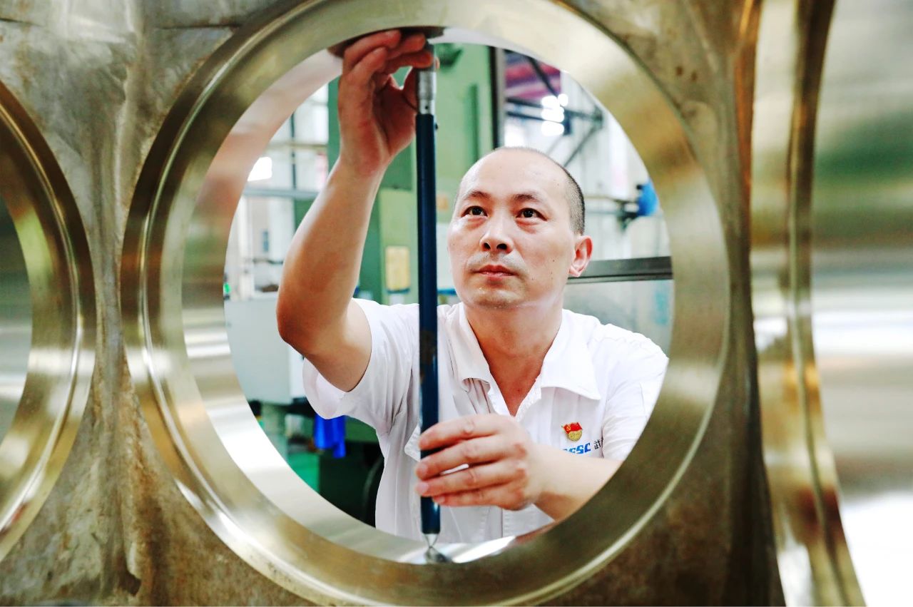 在武漢船機平臺生產(chǎn)現(xiàn)場,一名機床操作師傅,正在對加工后的零件進行檢測,專注的表情展現(xiàn)了船舶人嚴把質(zhì)量關(guān),人品以誠心為本,企品以恒心為要,產(chǎn)品以匠心為重的精神風貌。