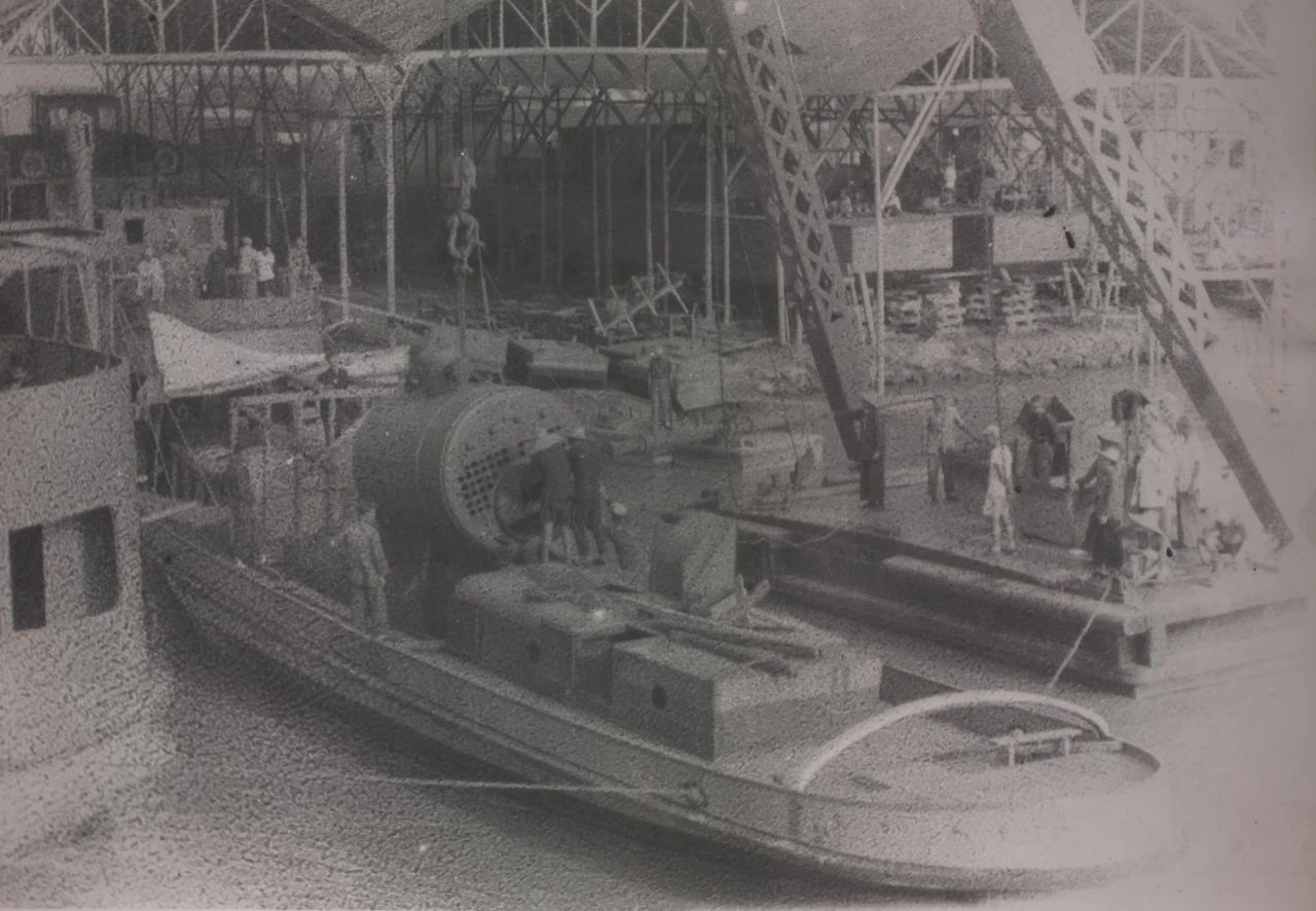 1934年武漢,上世紀(jì)30年代,武昌造船成立之初,工人們以手工作業(yè)“敲敲打打”形式開展修造船業(yè)務(wù)。修造的船只大多為100~300噸、鋼肋骨與木殼結(jié)構(gòu),僅有少量是鋼鉚接船體。建造的船只只能在長江上航行跑跑運(yùn)輸。為了生存和救國,船廠還建造一些農(nóng)用機(jī)械器具、槍支,以輔助民生、支援抗日。