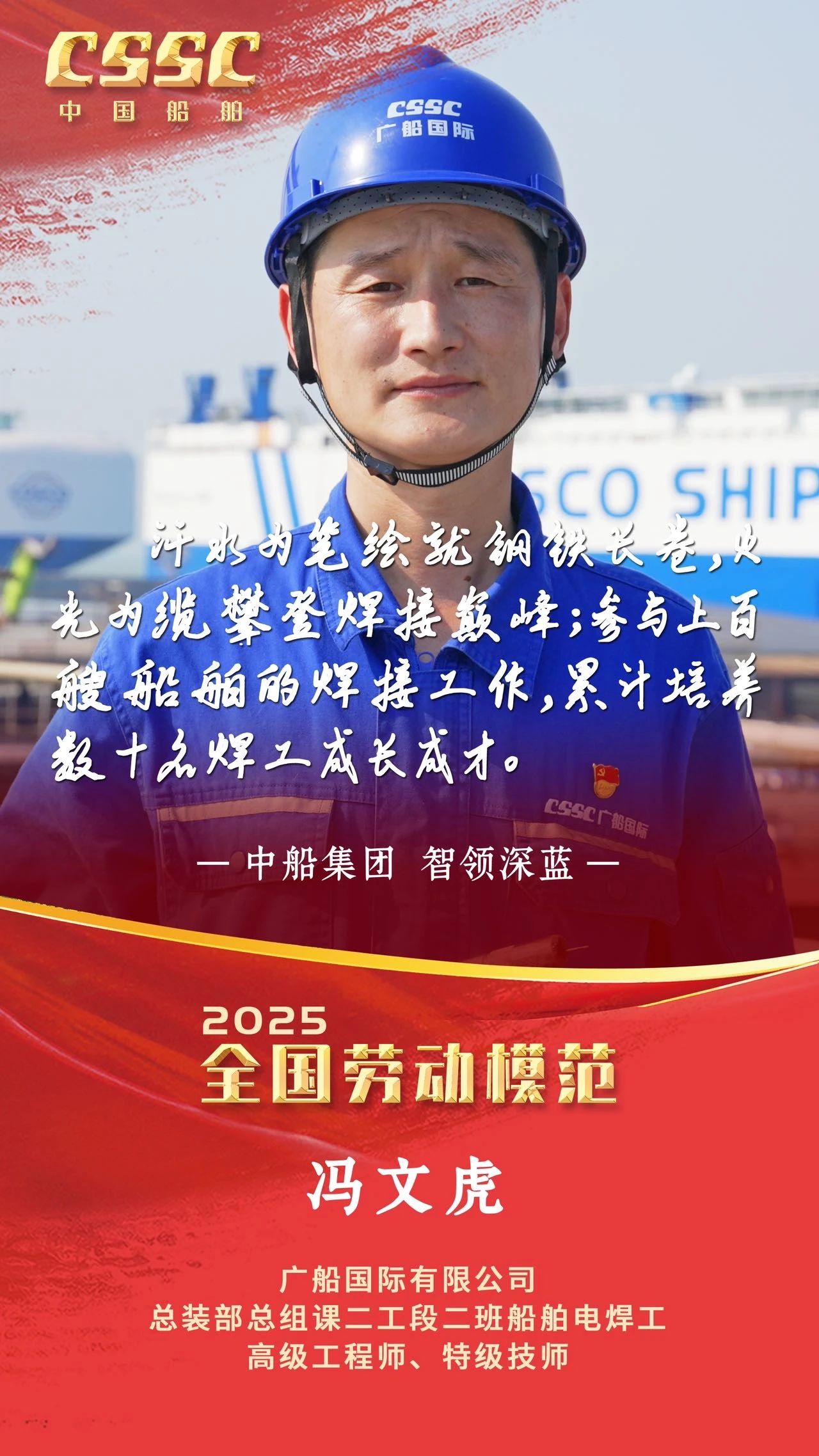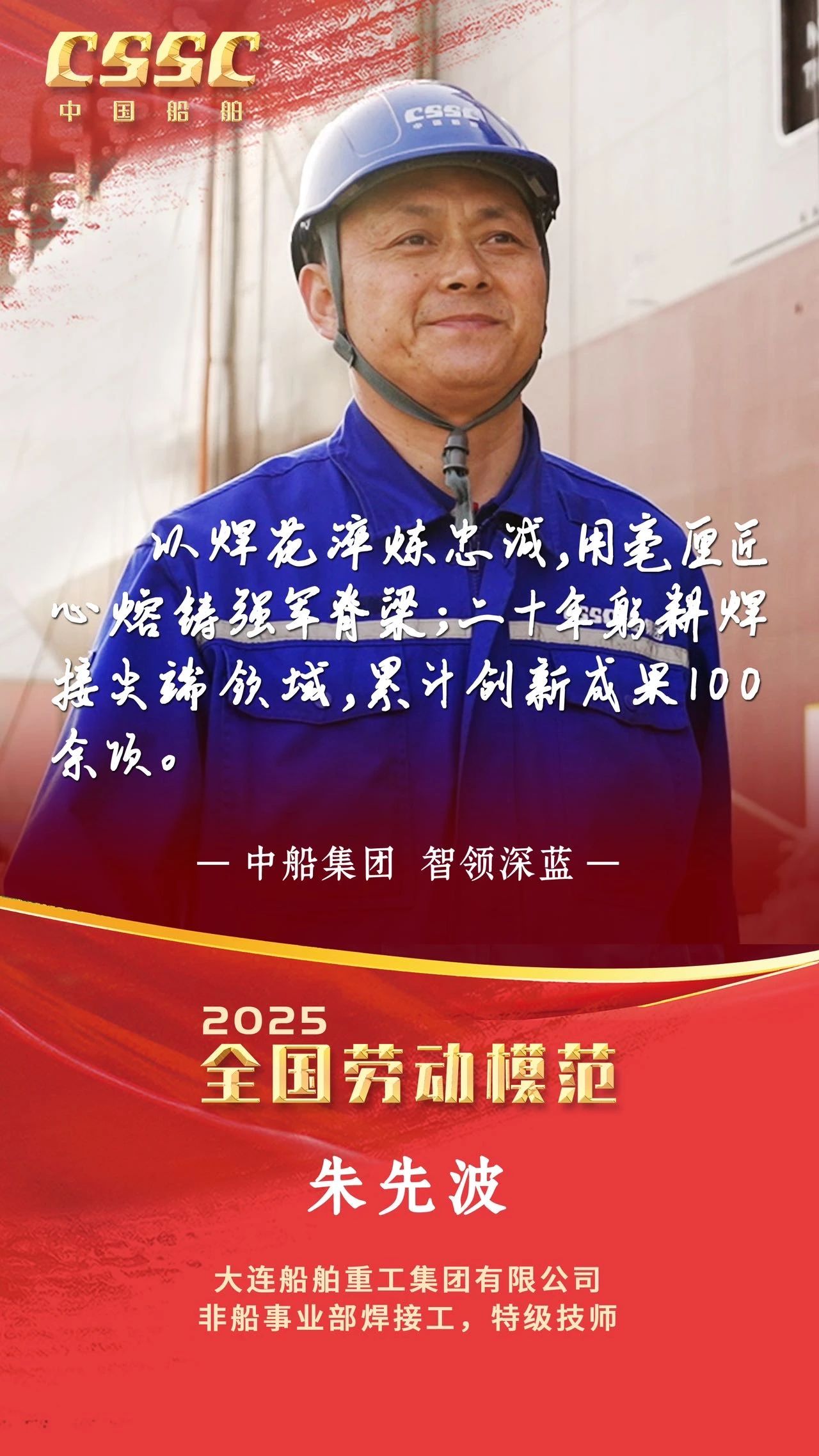 4月28日上午,慶祝中華全國總工會(huì)成立100周年暨全國勞動(dòng)模范和先進(jìn)工作者表彰大會(huì)在人民大會(huì)堂隆重舉行。大會(huì)宣讀了《中共中央、國務(wù)院關(guān)于表彰全國勞動(dòng)模范和先進(jìn)工作者的決定》。中船集團(tuán)5人被授予全國勞動(dòng)模范稱號,4人被授予全國先進(jìn)工作者稱號。