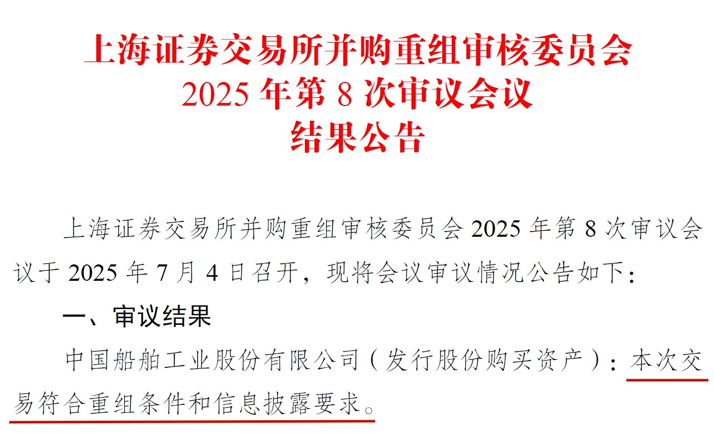 7月4日,上海證券交易所并購(gòu)重組審核委員會(huì)2025年第8次審議會(huì)議召開(kāi),審議結(jié)果為中國(guó)船舶工業(yè)股份有限公司(發(fā)行股份購(gòu)買資產(chǎn)):本次交易符合重組條件和信息披露要求。