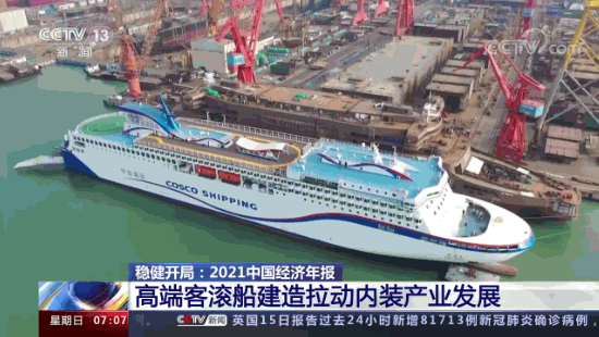 這里是中國(guó)船舶廣船國(guó)際的造船碼頭,多艘大型豪華客滾船正在緊張調(diào)試和建造。負(fù)責(zé)人告訴記者,2021年,像這樣的高端客滾船他們廠一共建造完工了5艘,產(chǎn)值占比達(dá)到約40%。
